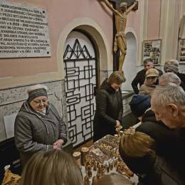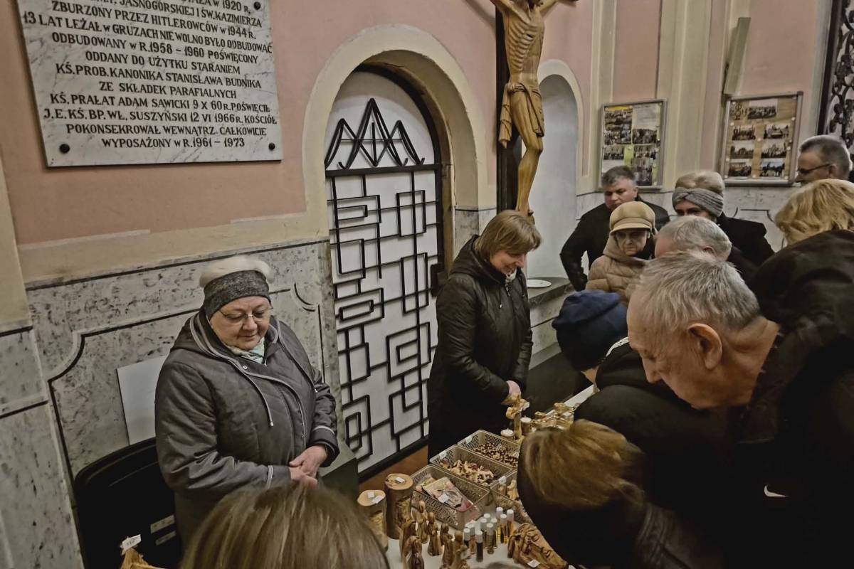 Przypominamy, że przed kościołem czekają na nas Siostry Służki NMP Niepokalanej z pięknie wykonanymi dewocjonaliami z drzewa oliwnego. Kupując je, możemy wesprzeć chrześcijan w Ziemi Świętej, borykających się obecnie z wojną i brakiem pielgrzymów